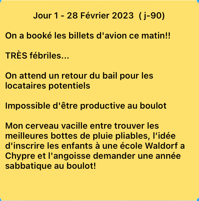 Pour une série de raisons, quelques unes plus valables que les autres, nous avons décidé de devancer la date de départ d’un an. Donc dans 90 jours!